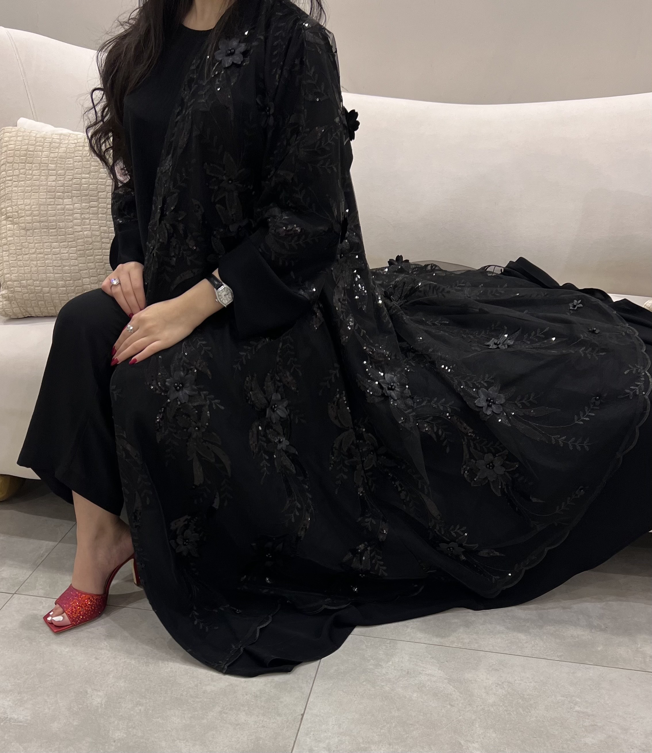 قماش بلاك بيري أسود وتُل مورّد مع طرحة سوداء، قصة كلوش