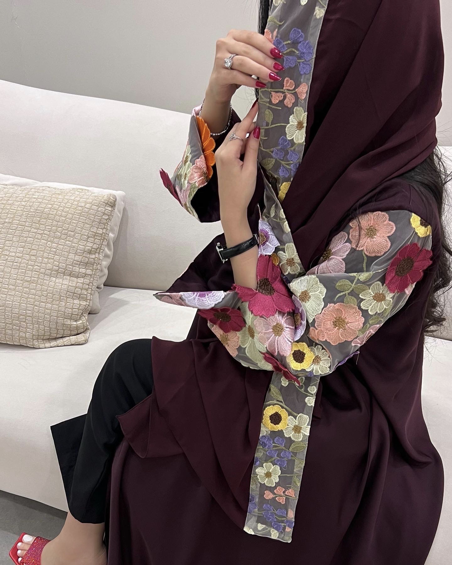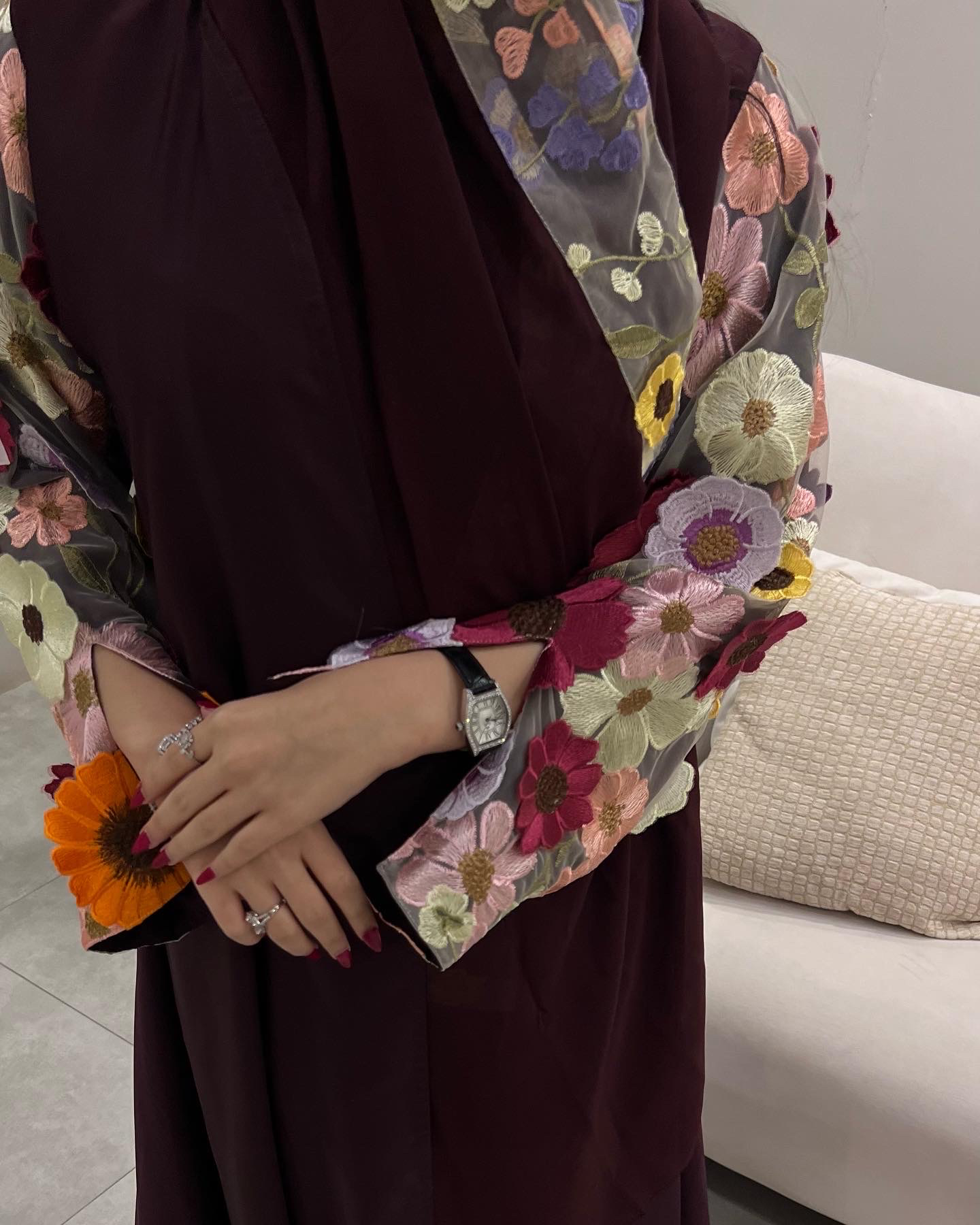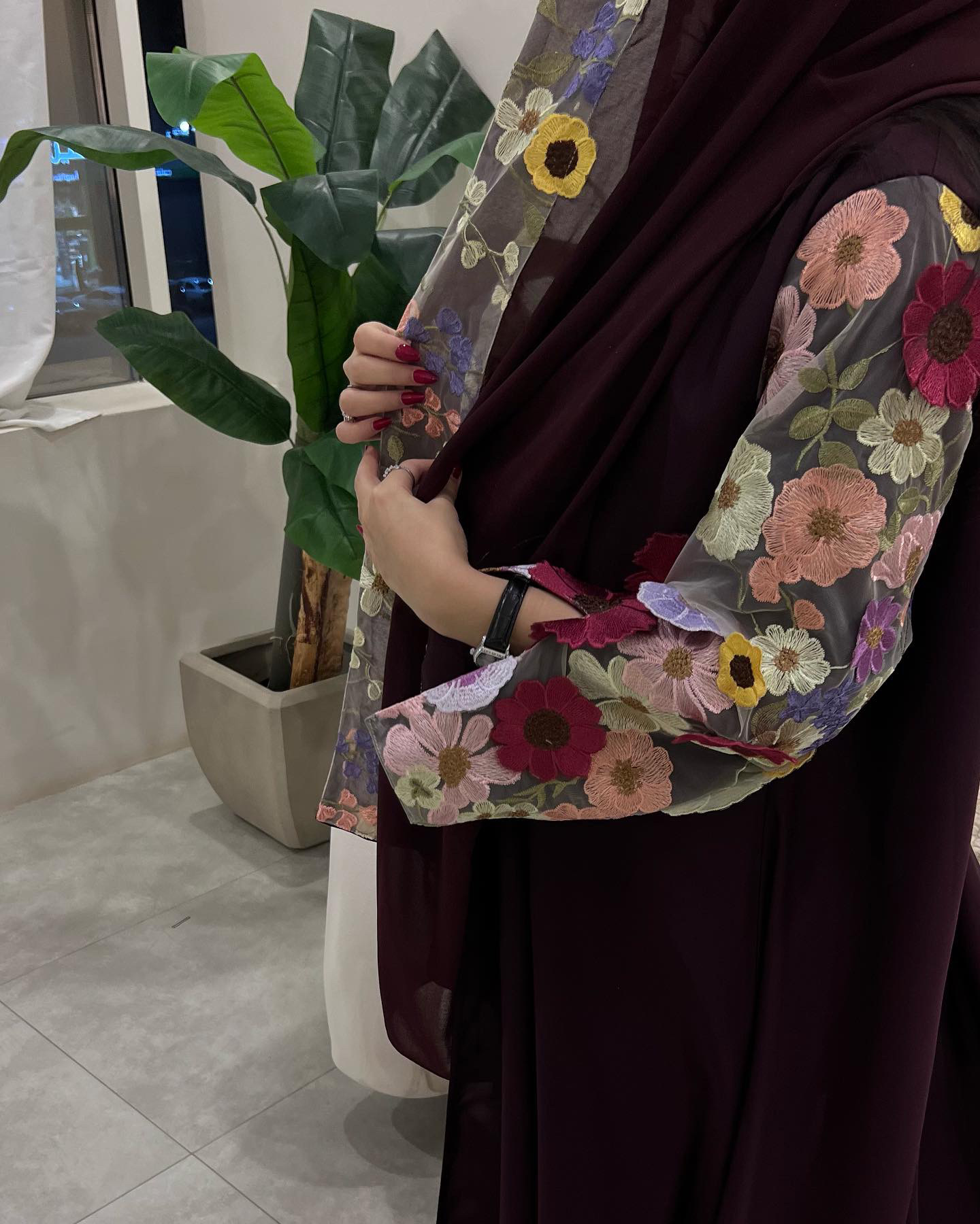 قماش بلاك بيري عنابي مع تل مورد كامل الأكمام، قصة كلوش