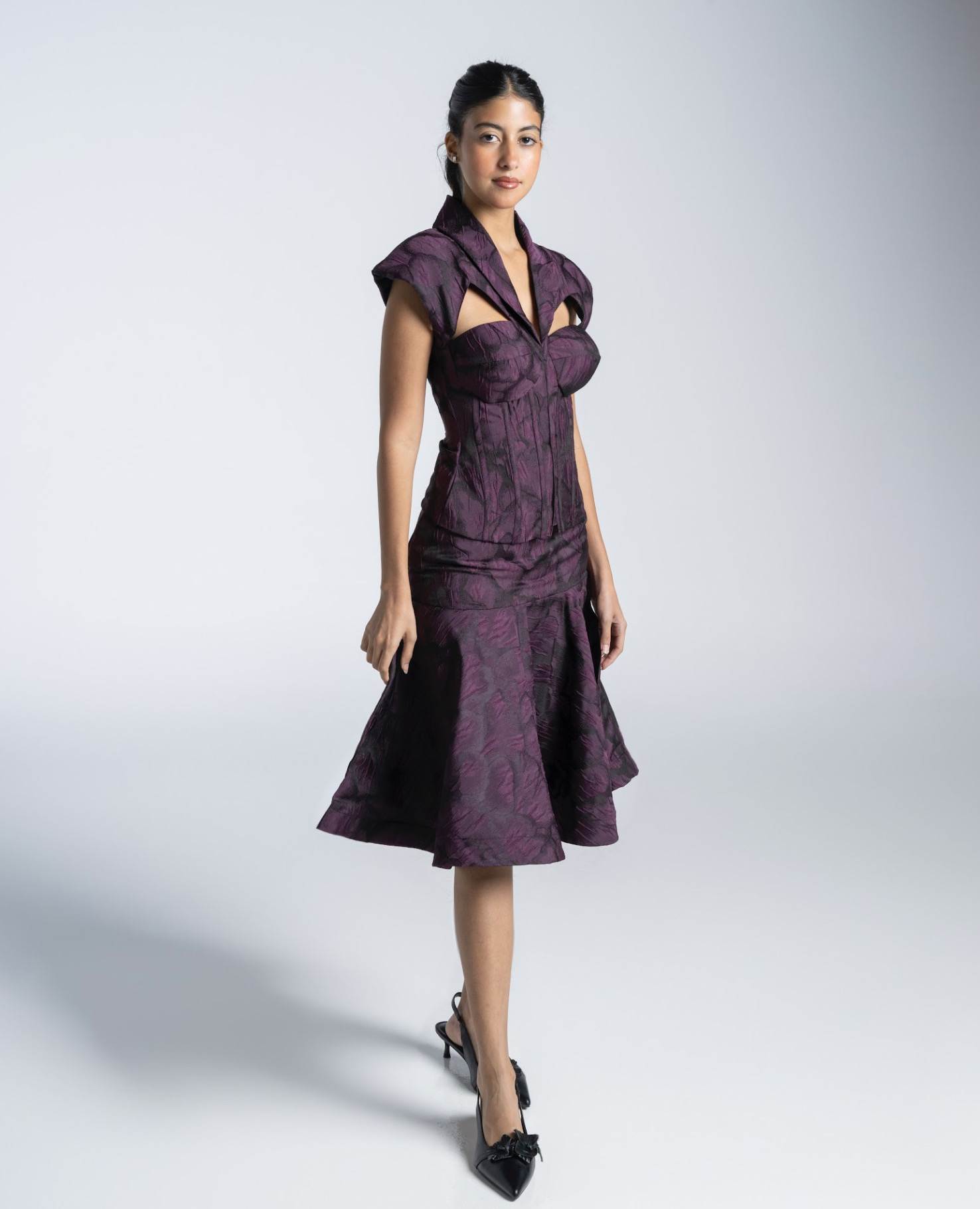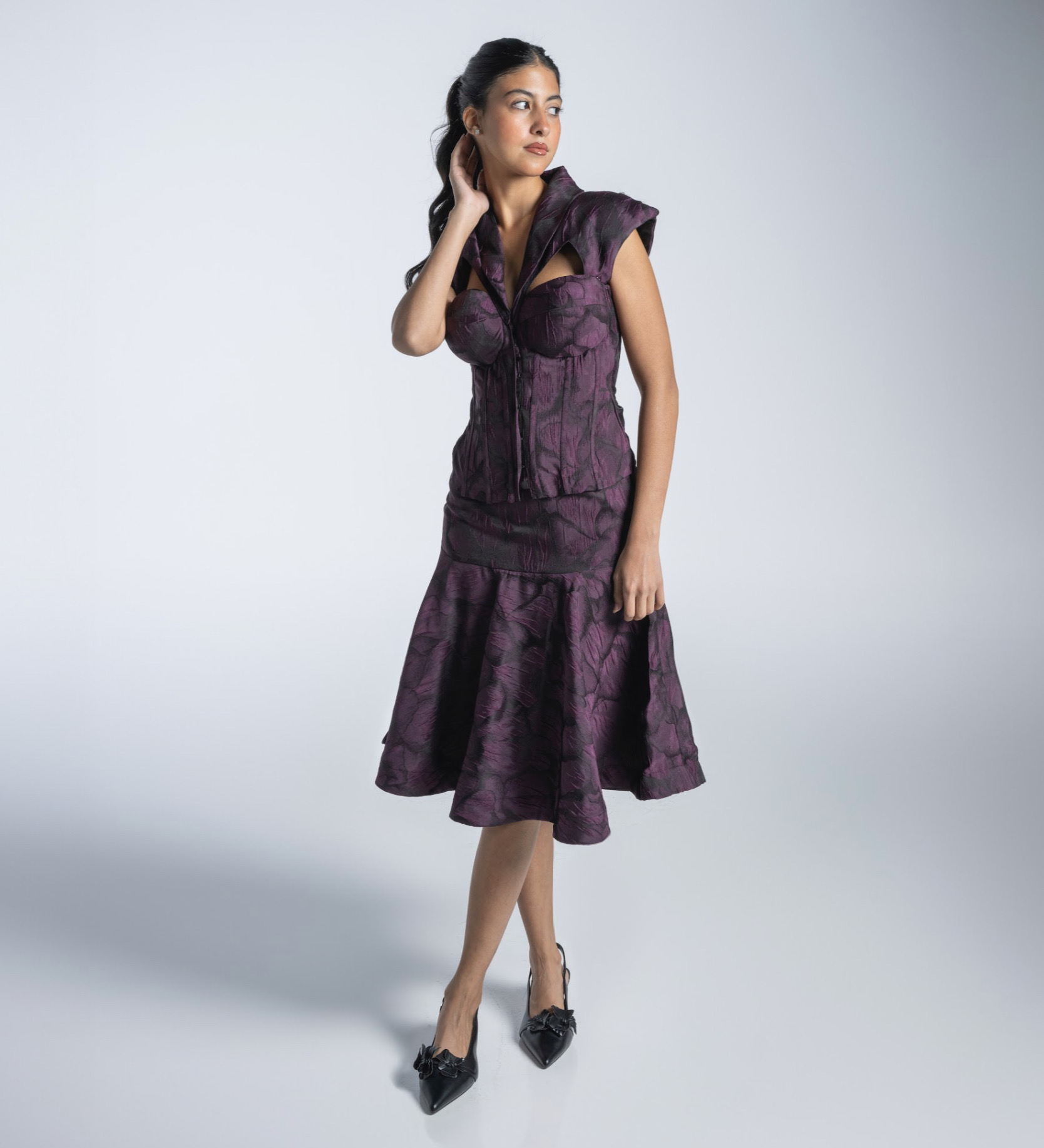التوب (الجزء العلوي): تصميم جذّاب بقصّة مُحددة تُبرز الخصر. فتحة مبتكرة عند الصدر تضفي لمسة جريئة وفخمة. أكتاف مُصممة بتفاصيل هندسية تبرز جمال التصميم. التنورة: تنورة ميدي بقصة واسعة تبدأ من الخصر لتمنحك إطلالة أنثوية مُنعشة. قماش منقوش بنمط خفيف يعزز من جمالية الطقم. قَصّة انسيابية تتيح الراحة والحركة بسهولة. المميزات: خامة عالية الجودة بلمسة ناعمة وفخمة. لون بنفسجي غامق بتفاصيل منقوشة تضفي عمقًا للإطلالة. مناسب للمناسبات الراقية، الحفلات، والسهرات المسائية.