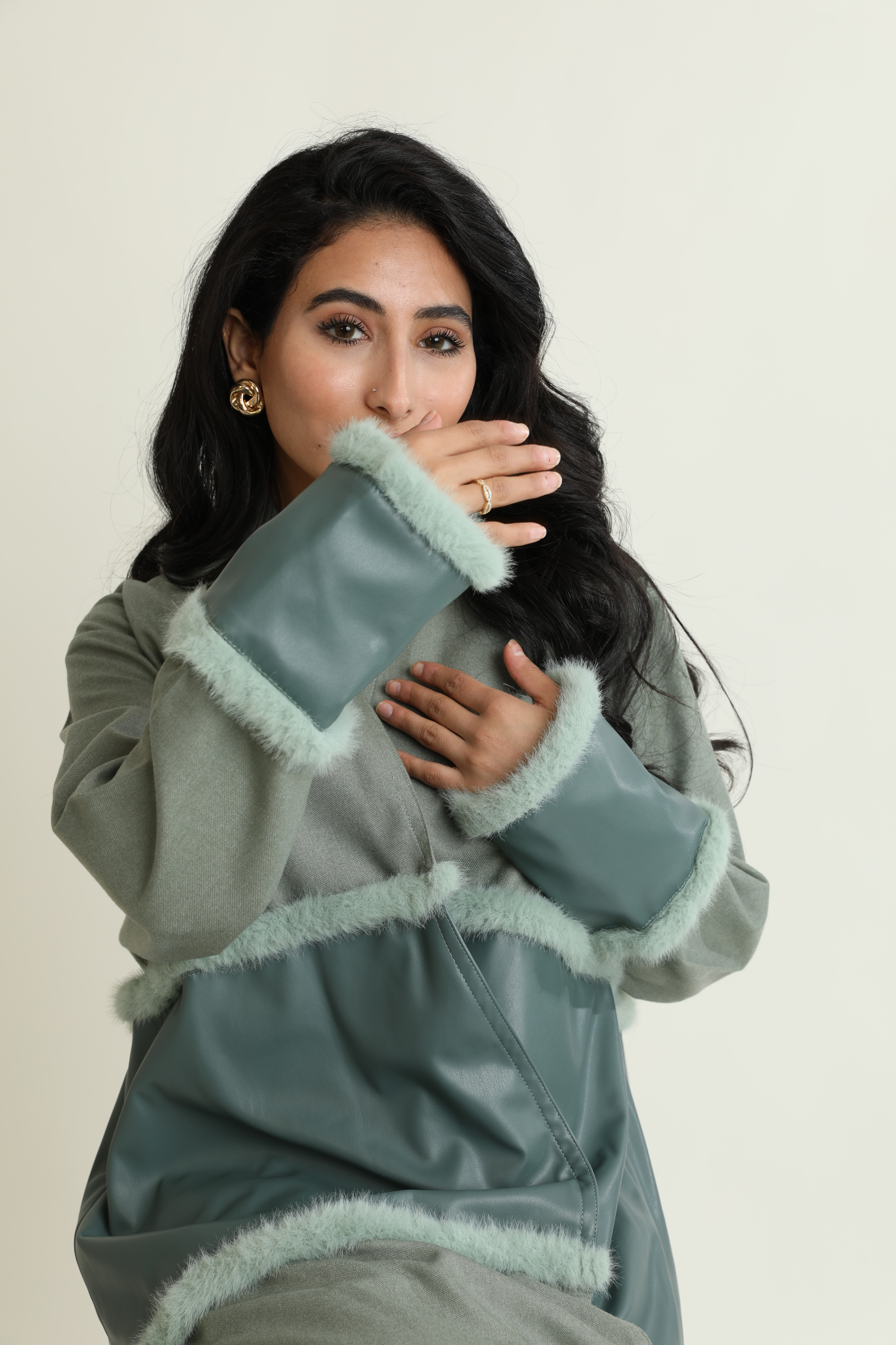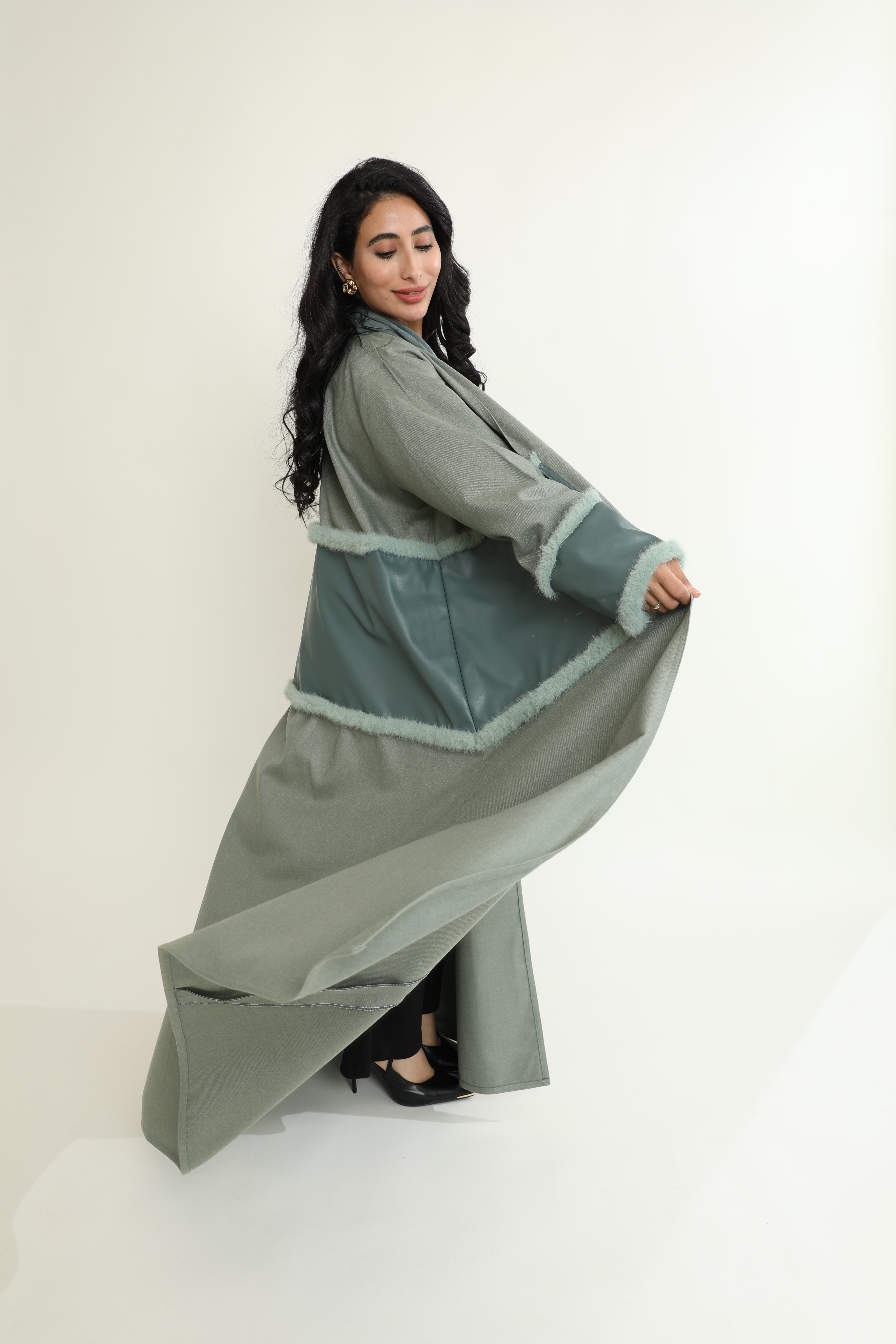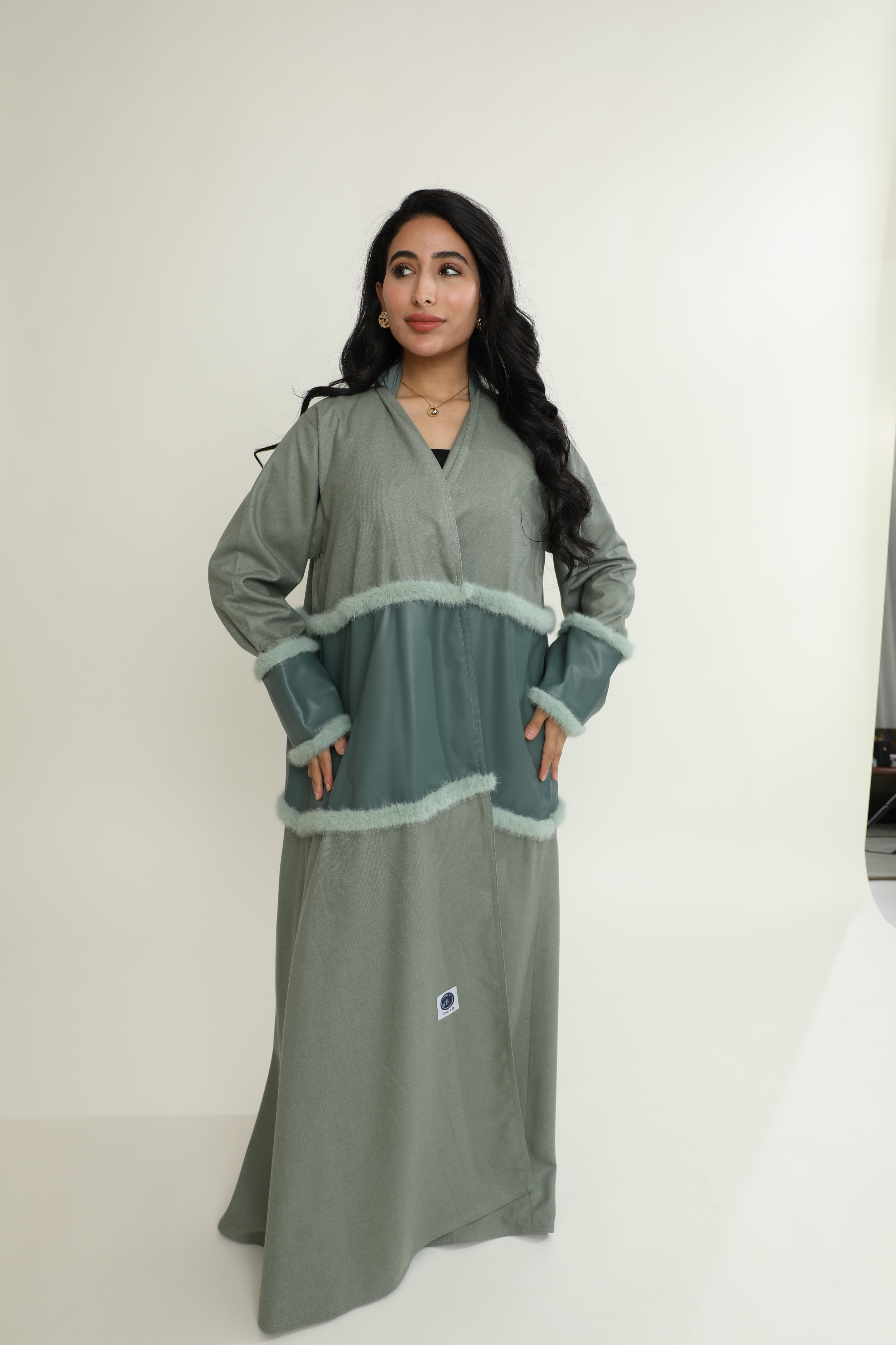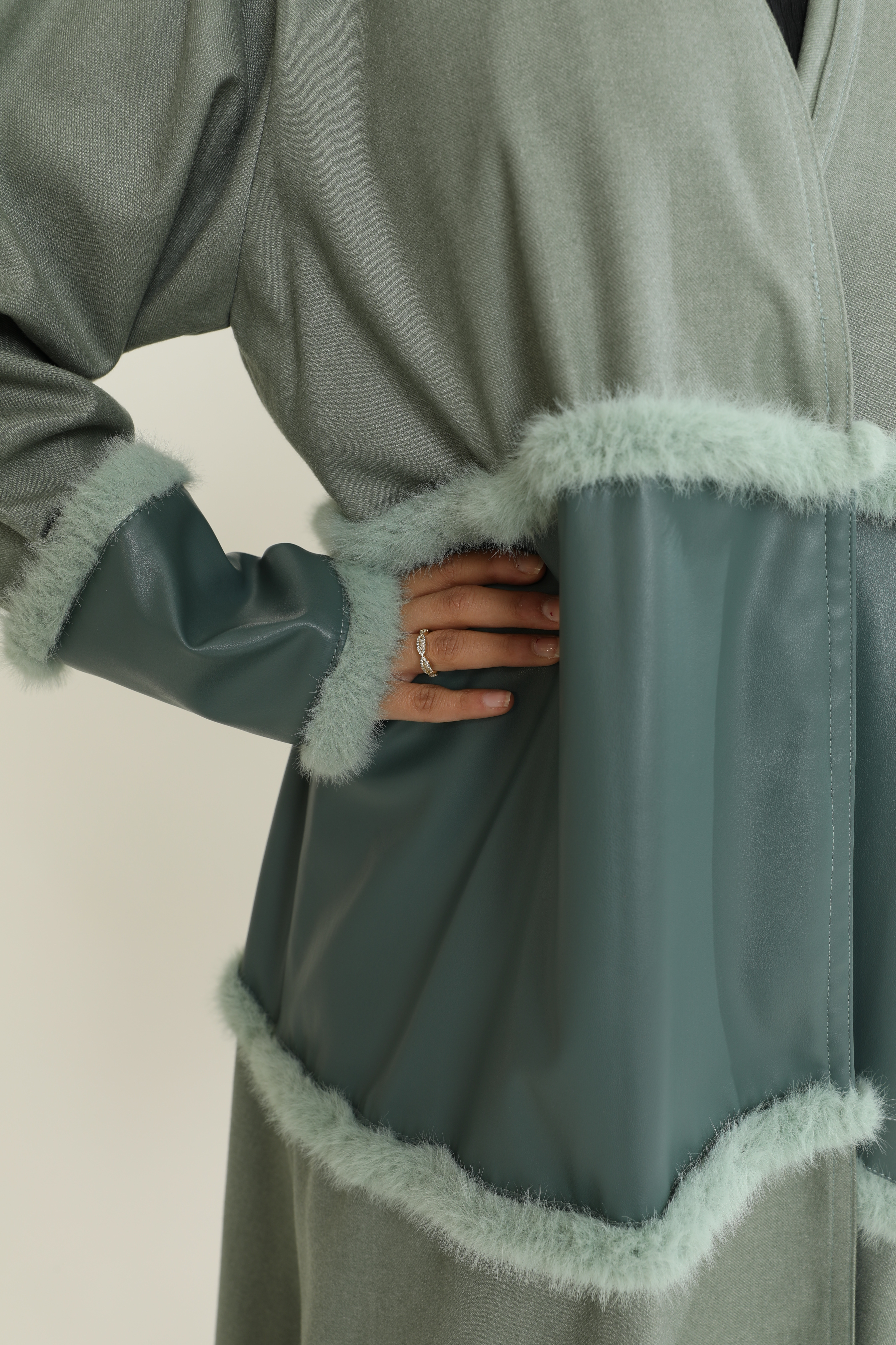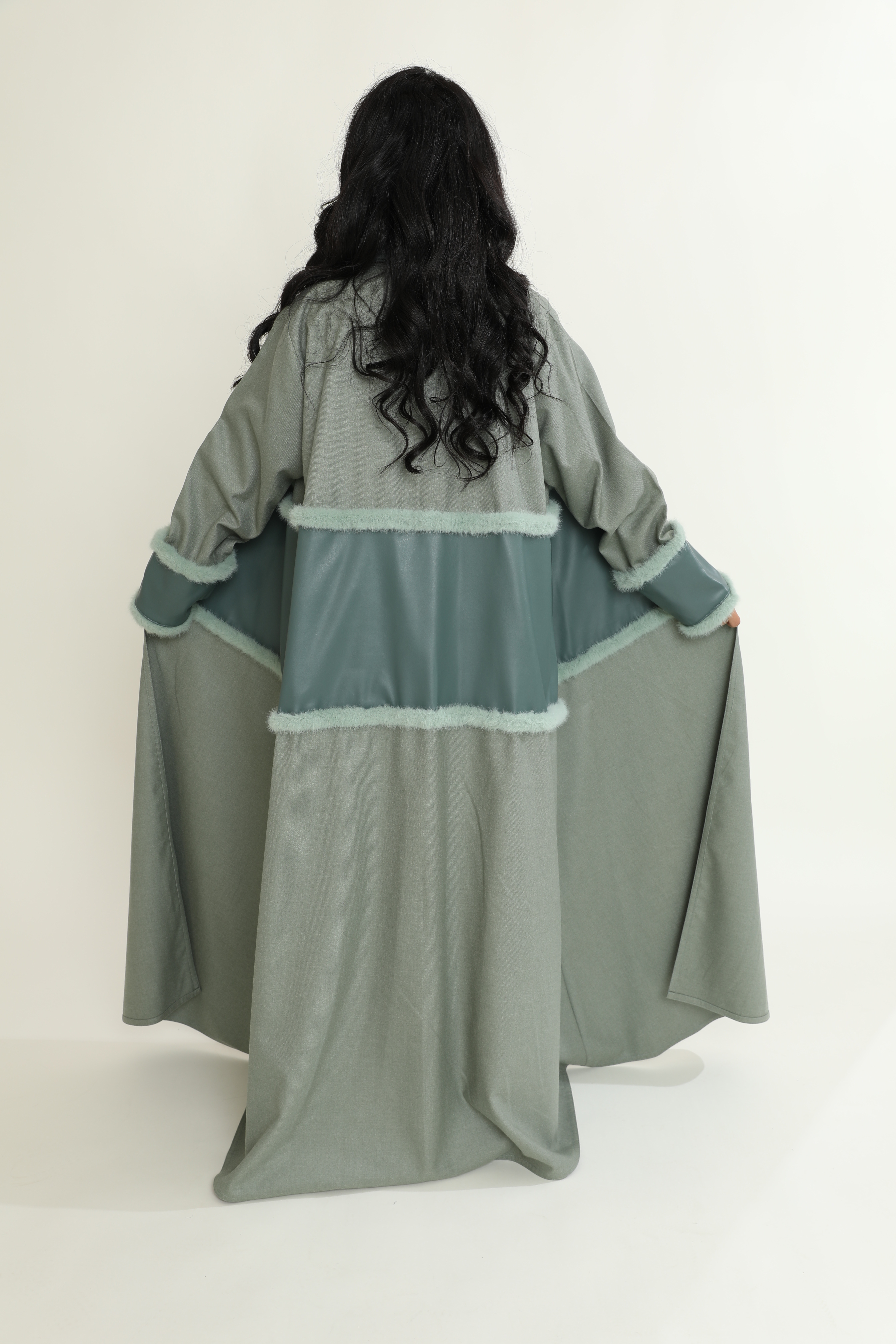 عباية جوخ بتدرجات التيفاني الفاخرة، تتوسطها لمسة من الجلد بنفس اللون، مزينة بالفرو لمظهر أنيق ودافئ يعكس الفخامة.