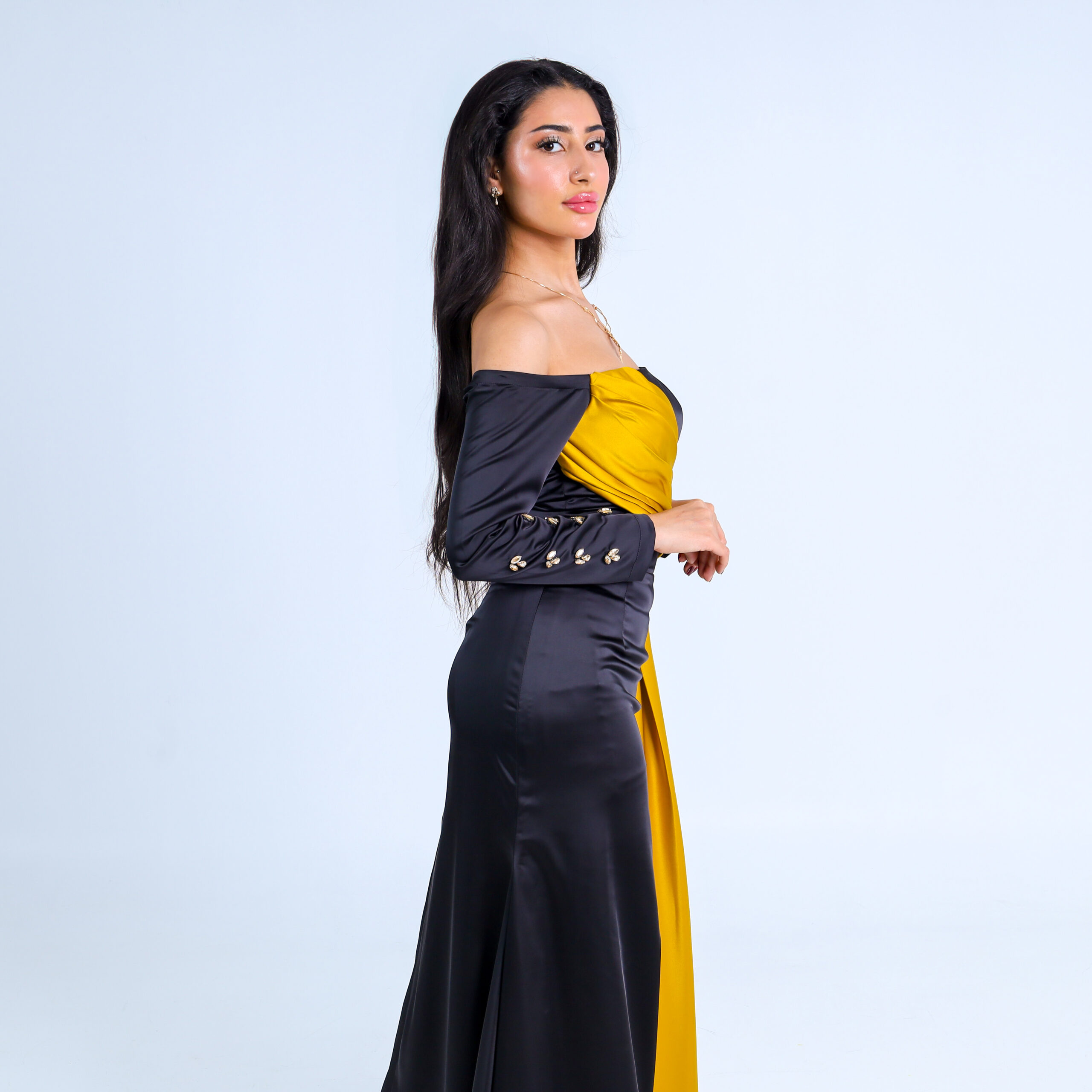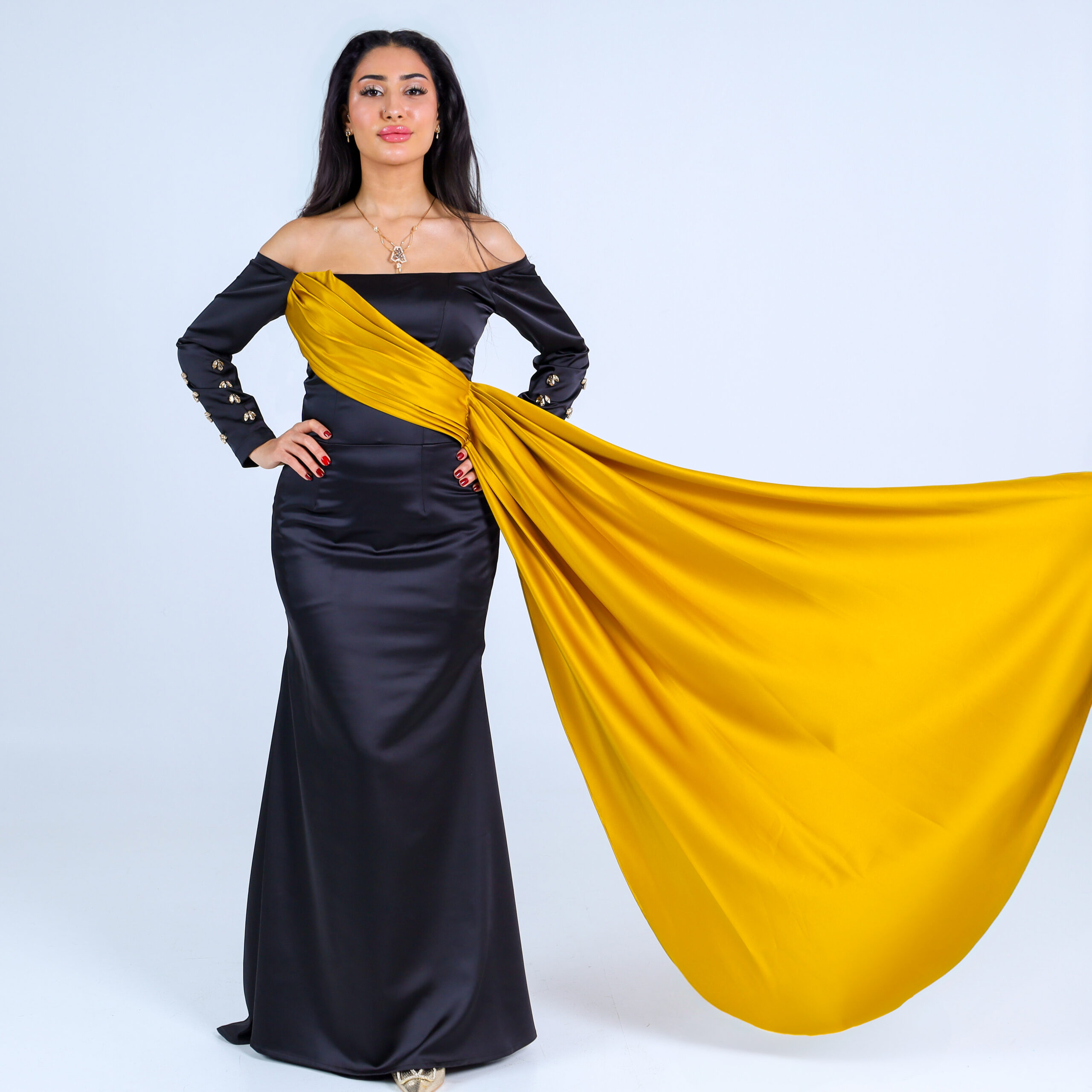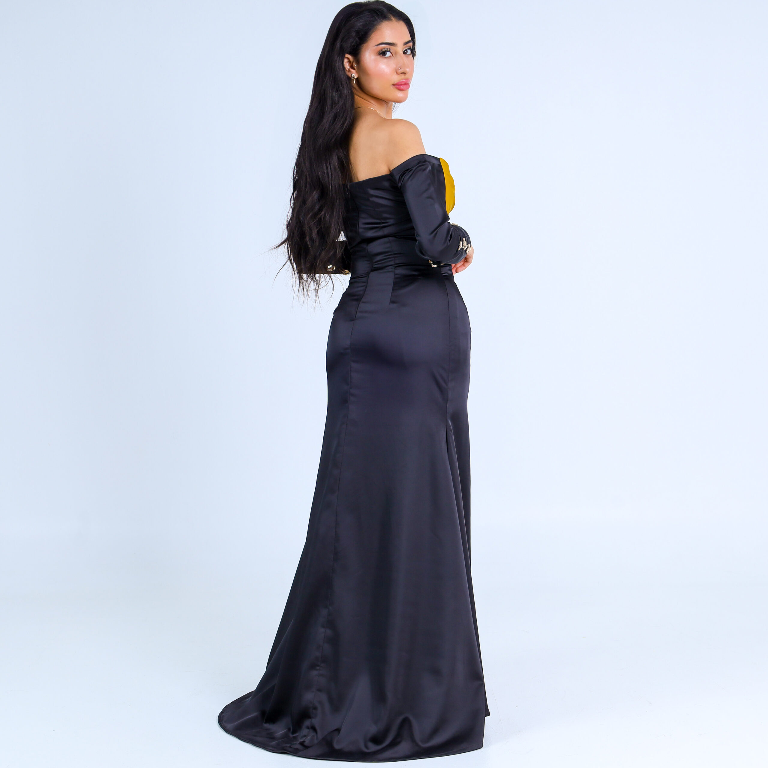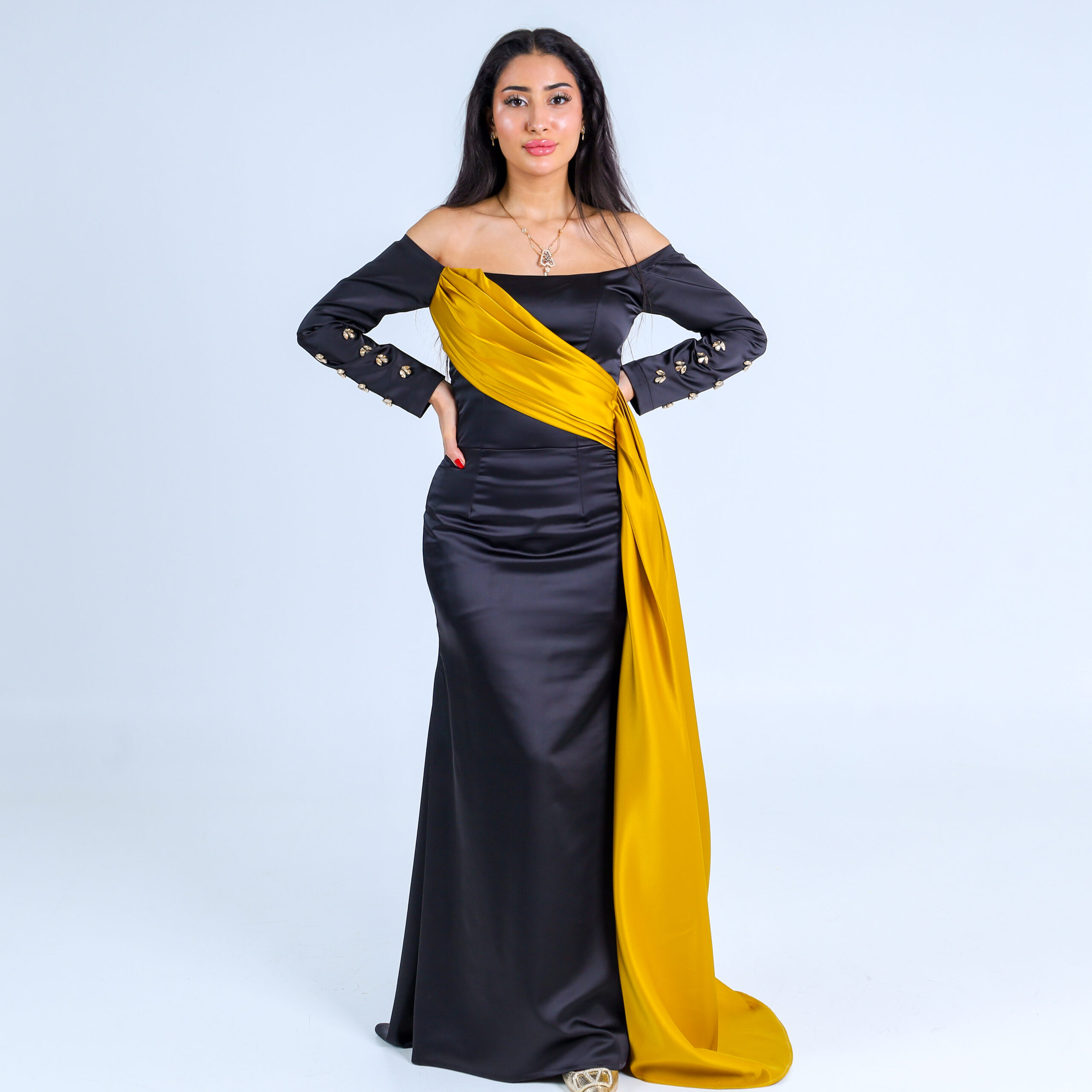 حين يلتقي الأسود الكلاسيكي ببريق الذهب والكريستال يتجسد فستان يروي حكاية فخامة و جمال يروى .مصمم لإطلالك المميزة التي تجعلكِ محط الأنظار في كل مناسبة.