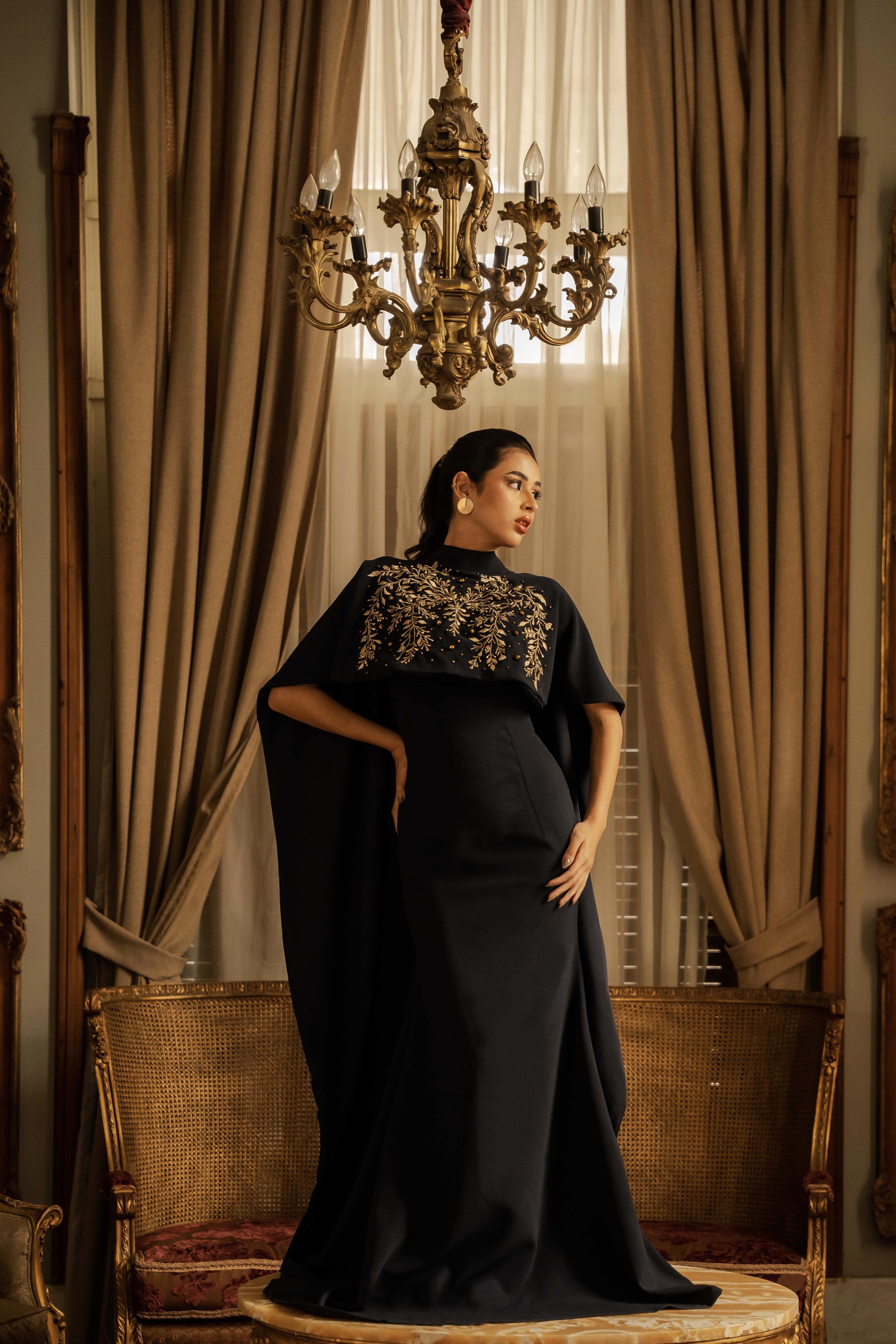 فستان مكون من قطعتين من كريب فاخر بلون كحلي عميق مزين بتطريز ذهبي. استشعري الفخامة، واجعلي كل حركة تنبض بالأناقة الملكية.