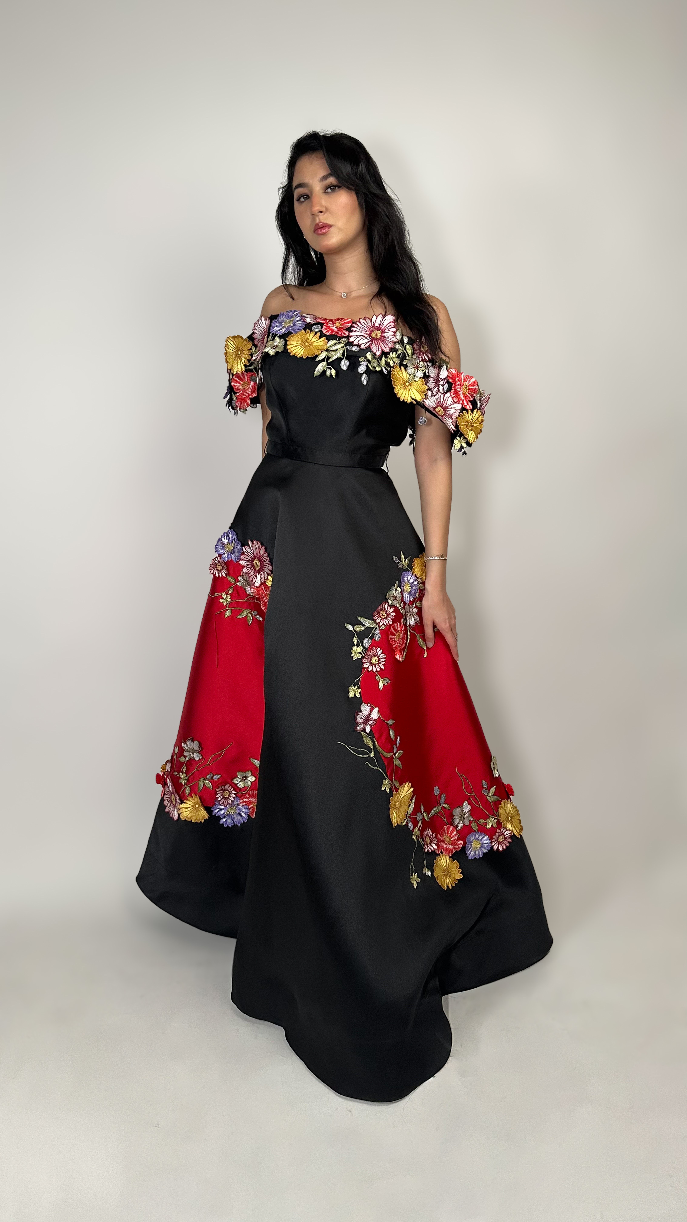 فستان سهرة اوف شولدر تفتة مزين بالورود