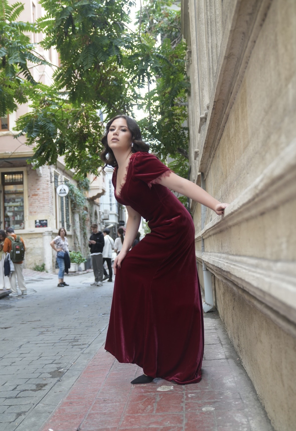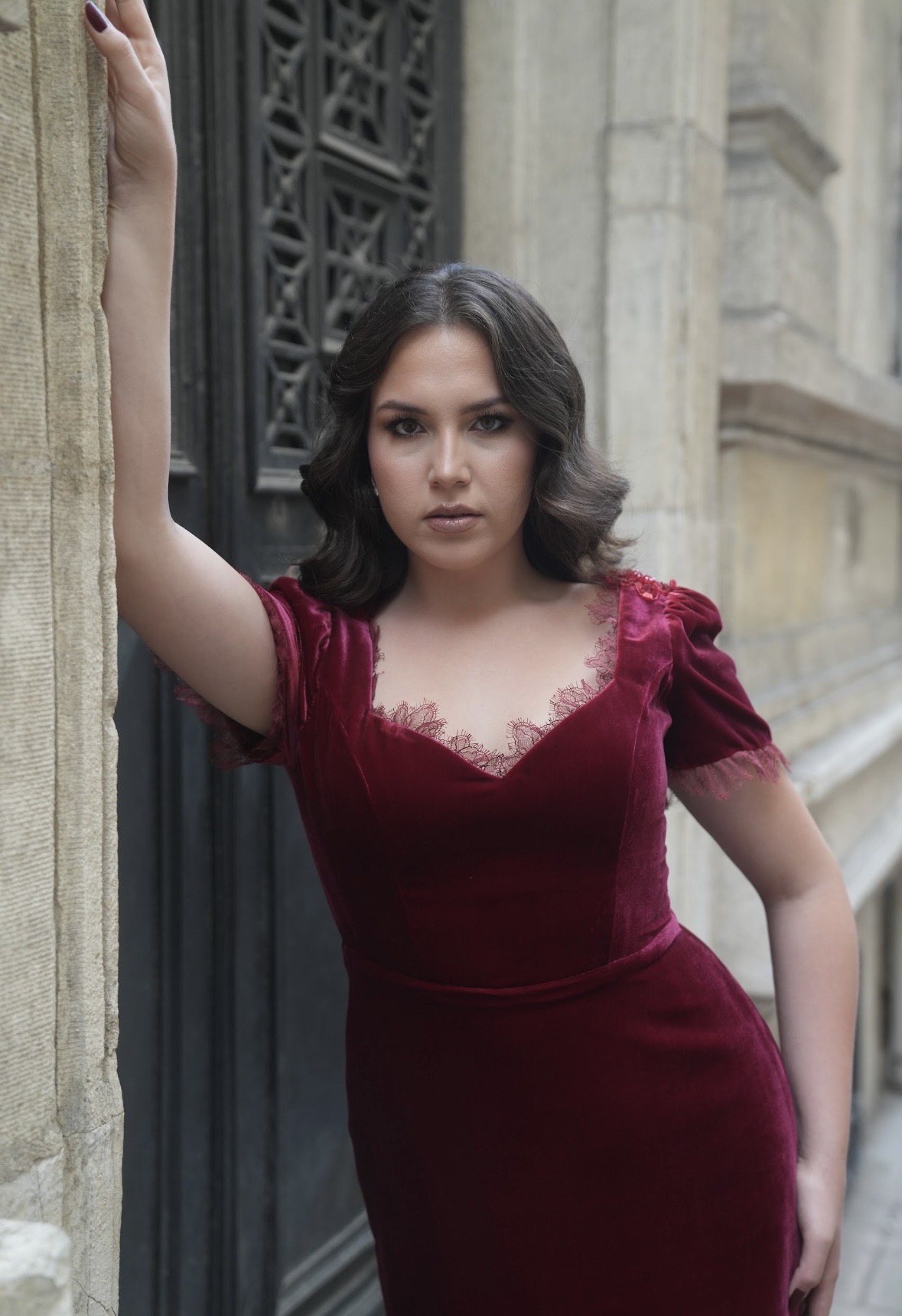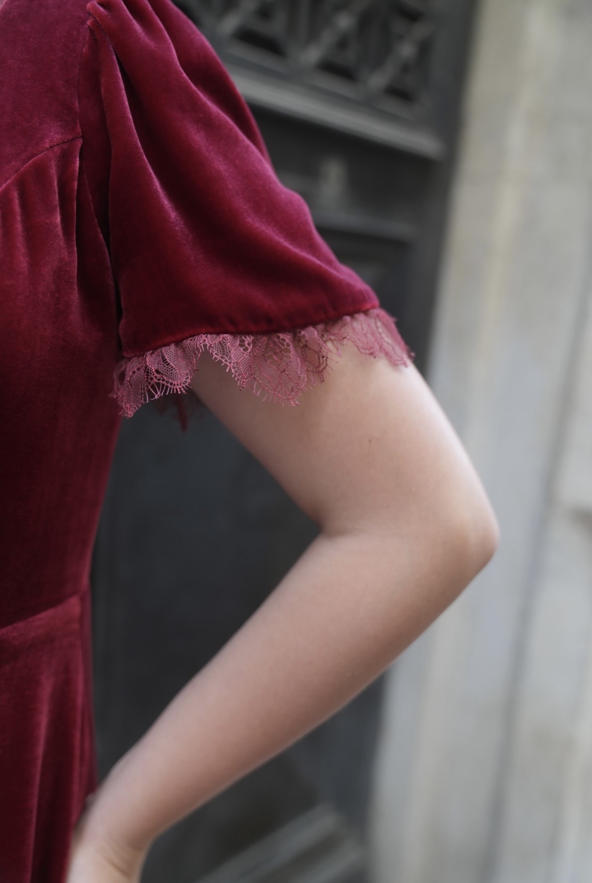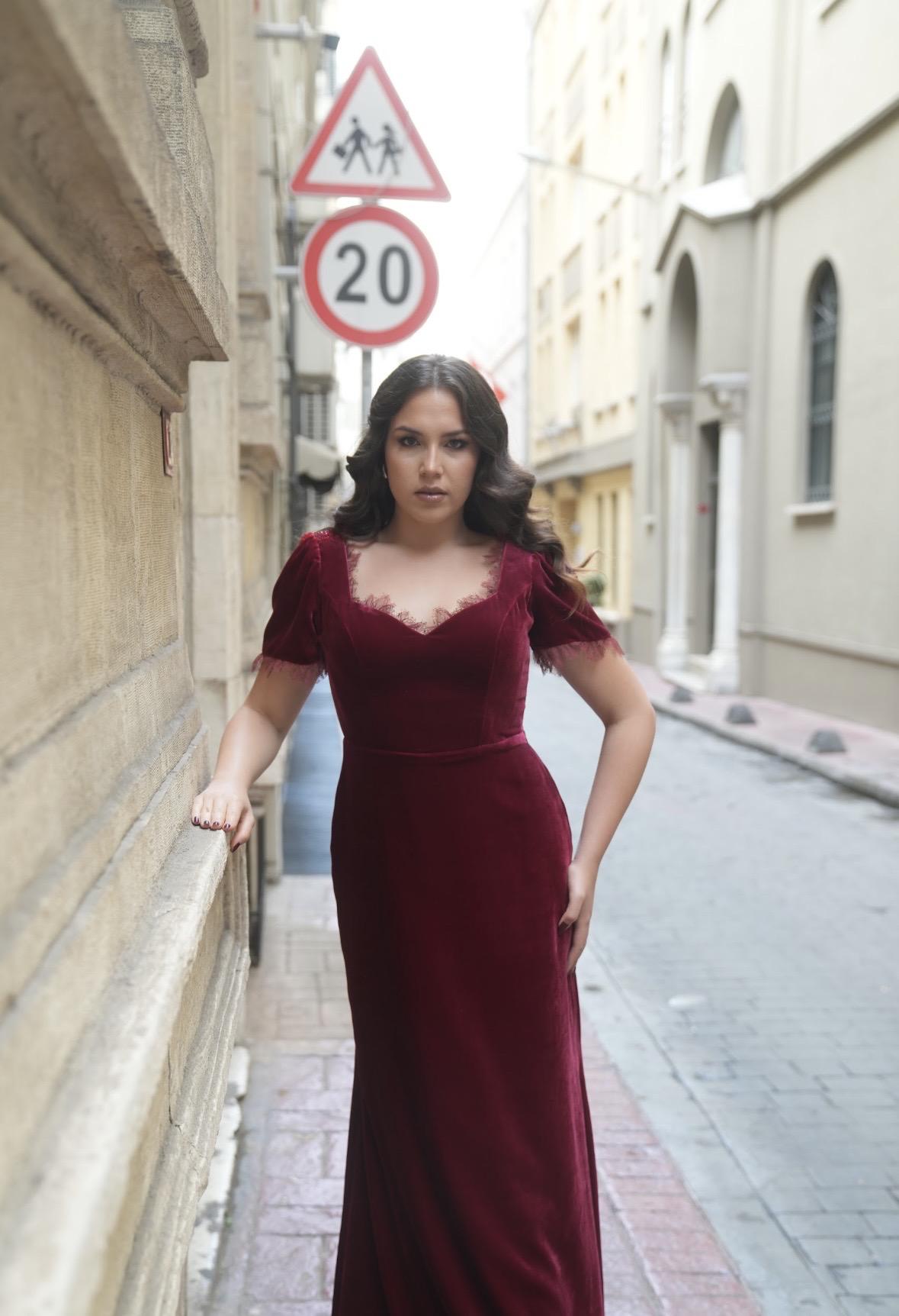 فستان مخمل طويل بأكمام قصيرة مع دانتيل ناهم على اطراف الكم والصدر